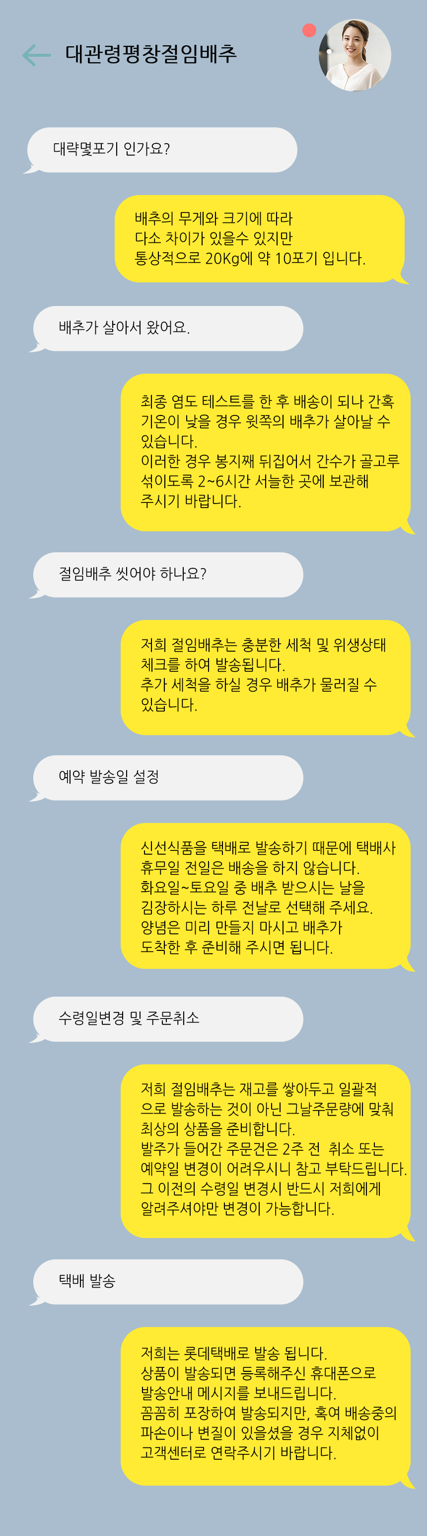 배추질이 매우 만족합니다. 김장해서 생김치 먹어보니 아주 맞이좋고 만족합니다. 배송시간도 아주 적절하게 오후 2~3시 사이에 도착해서 당일 김장 마무리 했습니다 모두만족하며 감사합니타