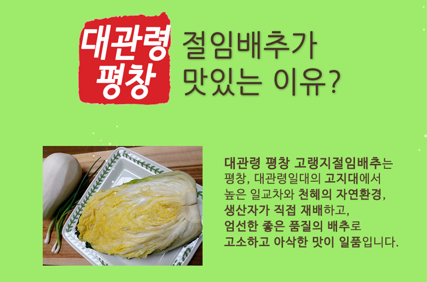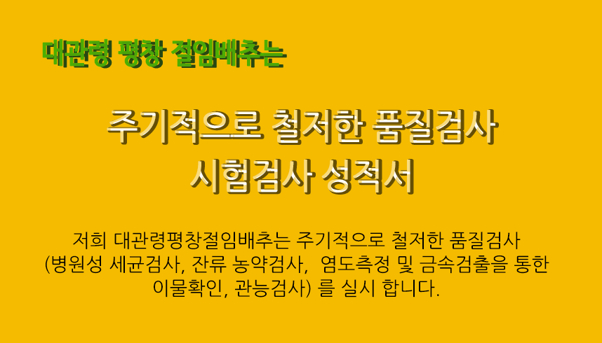 처음 강원도 배추를 시켰는데, 장모님이 생각외로 배추가 좋았다고 합니다. 겉과 속이 다 깨끗하고 생으로 먹어도 아삭하고 맛이 있다고 합니다. 포장도 잘되어서 와서 좋았습니다. 가격은 조금 비싼데 만족합니다. 다음에 또 주문하여고 합니다. 많이 파세요.